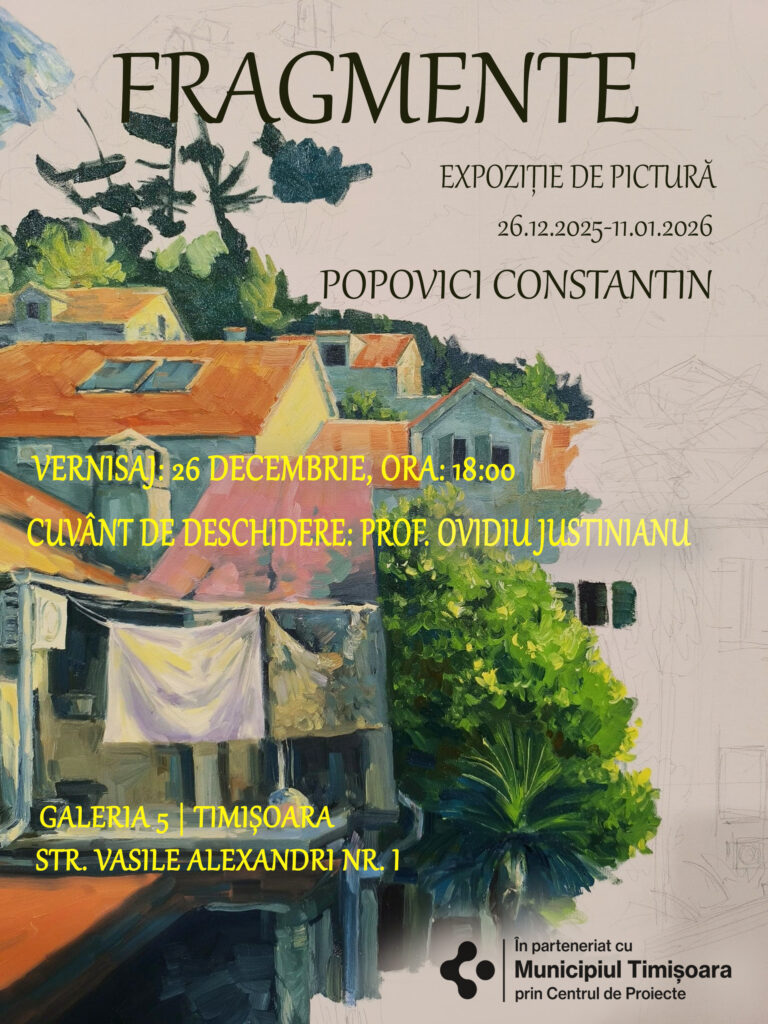 11 ianuarie | orele 10:00 – 13:00FRAGMENTE este o expoziție personală de pictură care propune o incursiune vizuală în locuri reale, surprinse inițial prin fotografii originale realizate de artist în timpul călătoriilor sale. Peisaje montane, cadre urbane și întinderi de apă sunt reinterpretate într-o manieră realistă, cu accente picturale, devenind fragmente de memorie, emoție și trăire personală.