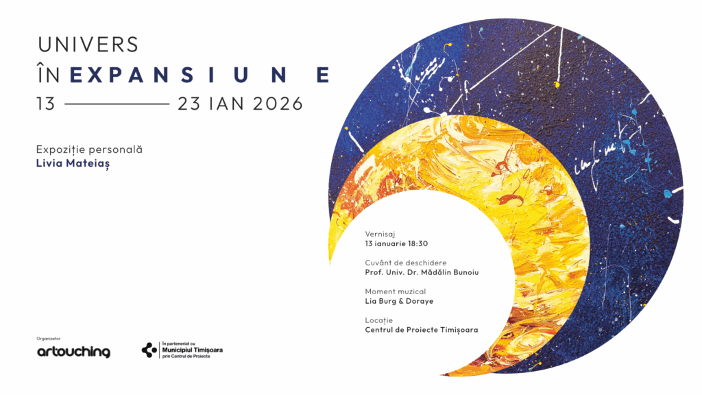 De la mic la mare, către infinit și dincolo de el, Livia Mateiaș vă invită la o călătorie cosmică imaginară. Pentru a păși în magia dimensiunii 4.0… vă invităm să faceți primul pas cu prezență într-un ,,Univers în expansiune” o expoziție de pictură a artistei Livia Mateiaș. Deschiderea portalului cosmic va avea loc în data de 13 ianuarie începând cu ora 18.30 la Centrul de Proiecte Timișoara. Cuvântul va fi rostit de prof. univ. dr. Mădălin Bunoiu și sunetul adus prin Lia Burg și Doraye.